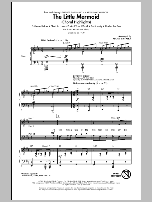 Download or print Mark Brymer The Little Mermaid (Choral Highlights) sheet music, chords and digital score arranged for 3-Part Mixed Choir. This Disney score includes 30 page(s).