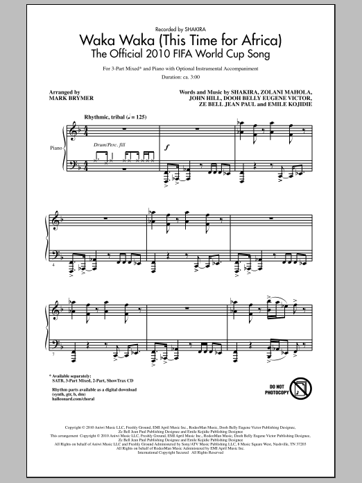 Download or print Mark Brymer Waka Waka (This Time For Africa) - The Official 2010 FIFA World Cup Song sheet music, chords and digital score arranged for 3-Part Mixed Choir. This Pop score includes 15 page(s).