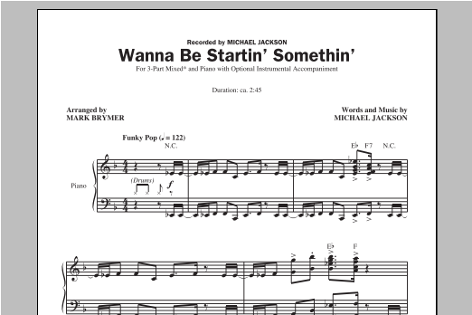 Download or print Mark Brymer Wanna Be Startin' Somethin' sheet music, chords and digital score arranged for 3-Part Mixed Choir. This Pop score includes 1 page(s).