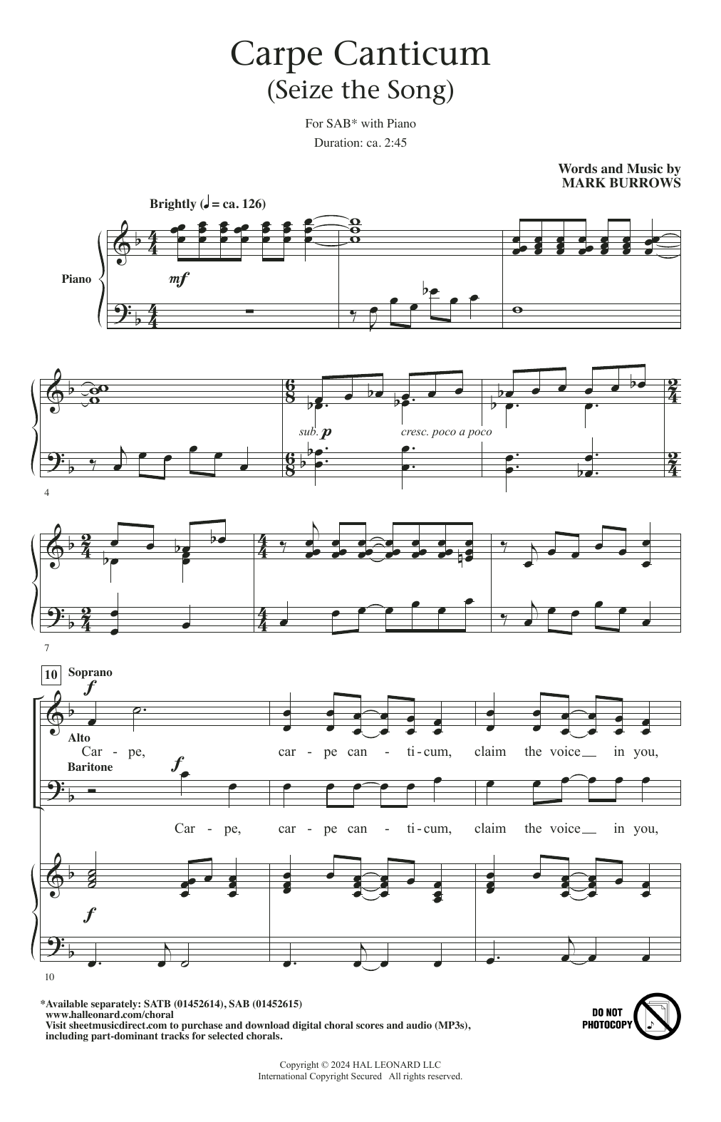 Download or print Mark Burrows Carpe Canticum (Seize The Song) sheet music, chords and digital score arranged for SAB Choir. This Concert score includes 11 page(s).