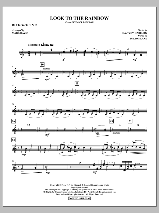 Download or print Mark Hayes Look To The Rainbow - Bb Clarinet 1,2 sheet music, chords and digital score arranged for Choir Instrumental Pak. This Film/TV score includes 2 page(s).