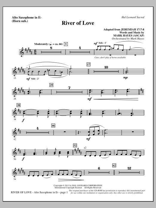 Download or print Mark Hayes River Of Love - Alto Sax (sub. Horn) sheet music, chords and digital score arranged for Choir Instrumental Pak. This Concert score includes 3 page(s).