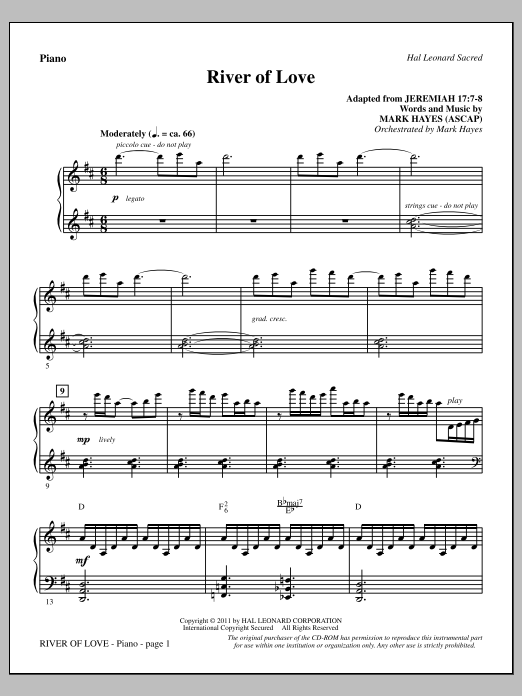 Download or print Mark Hayes River Of Love - Piano sheet music, chords and digital score arranged for Choir Instrumental Pak. This Concert score includes 7 page(s).