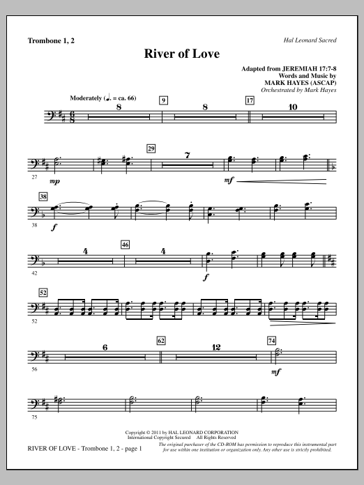 Download or print Mark Hayes River Of Love - Trombone 1 & 2 sheet music, chords and digital score arranged for Choir Instrumental Pak. This Concert score includes 3 page(s).