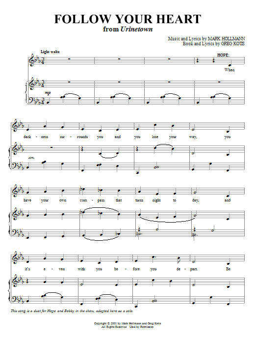 Download or print Mark Hollmann Follow Your Heart sheet music, chords and digital score arranged for Lead Sheet / Fake Book. This Musical/Show score includes 2 page(s).