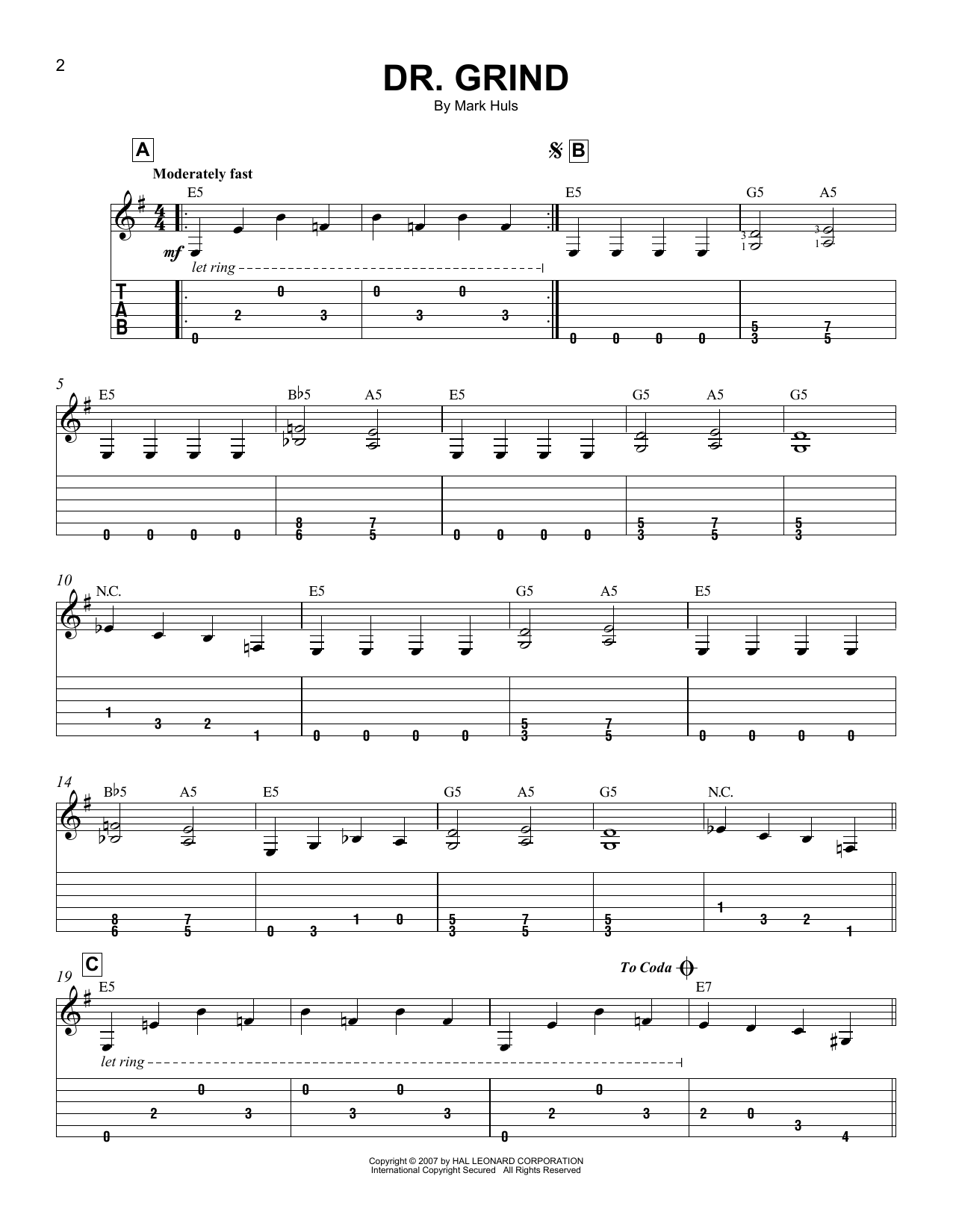 Download or print Mark Huls Dr. Grind sheet music, chords and digital score arranged for Easy Guitar Tab. This Instructional score includes 2 page(s).