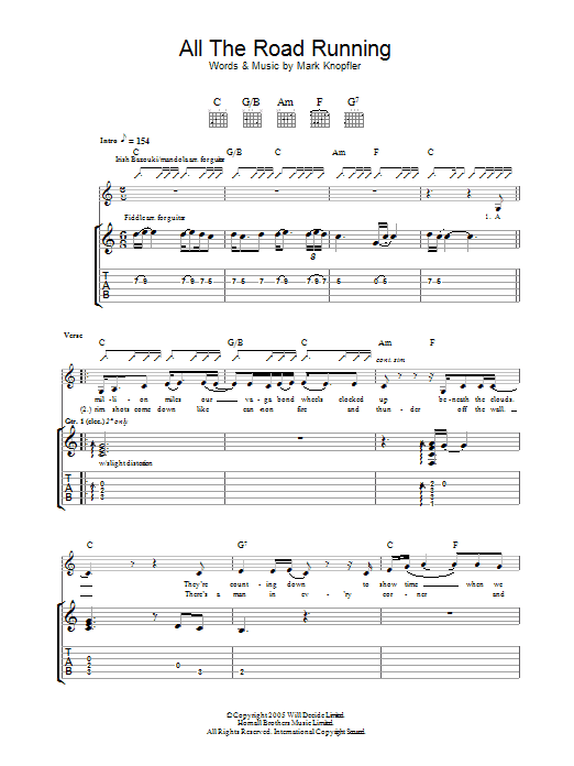 Download or print Mark Knopfler All The Road Running sheet music, chords and digital score arranged for Guitar Tab. This Country score includes 5 page(s).