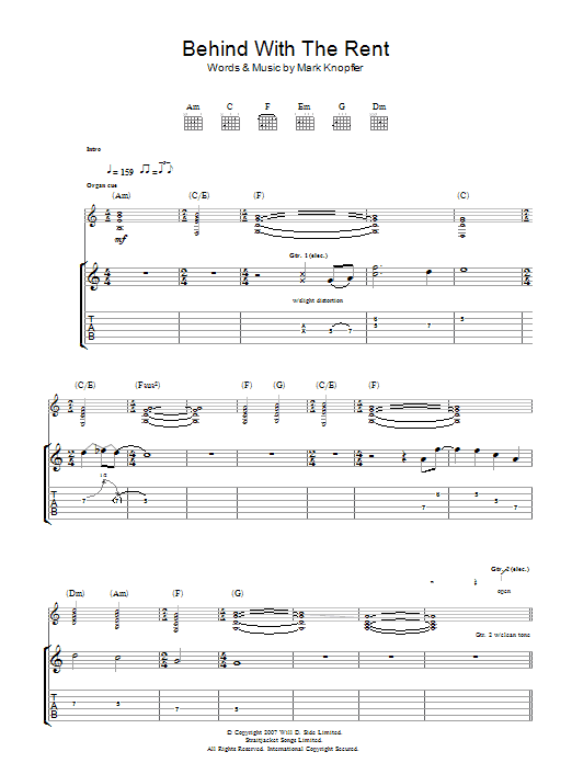 Download or print Mark Knopfler Behind With The Rent sheet music, chords and digital score arranged for Guitar Tab. This Rock score includes 8 page(s).