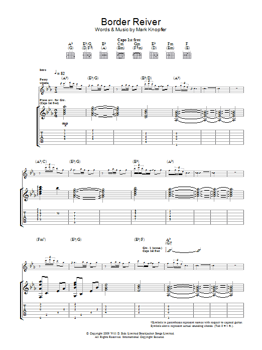 Download or print Mark Knopfler Border Reiver sheet music, chords and digital score arranged for Guitar Tab. This Rock score includes 6 page(s).