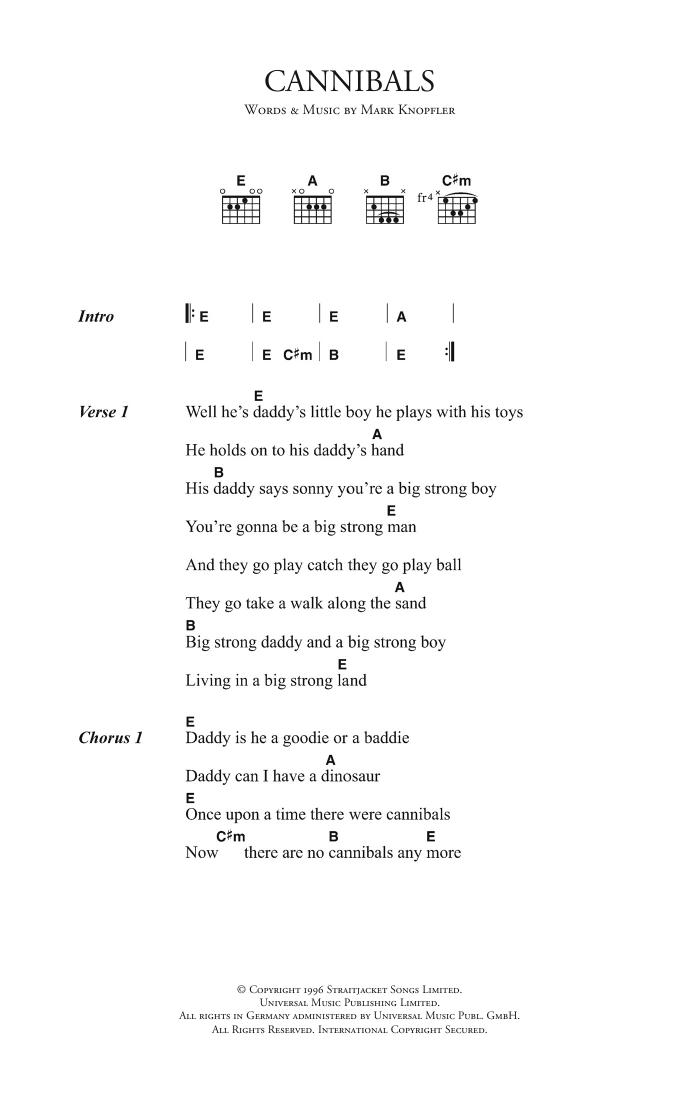 Download or print Mark Knopfler Cannibals sheet music, chords and digital score arranged for Guitar Chords/Lyrics. This Rock score includes 3 page(s).