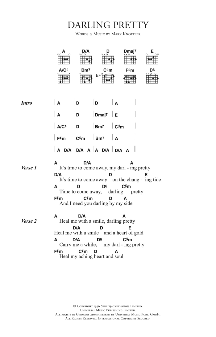 Download or print Mark Knopfler Darling Pretty sheet music, chords and digital score arranged for Guitar Tab. This Rock score includes 8 page(s).