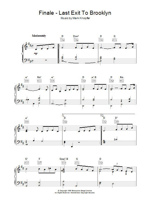 Download or print Mark Knopfler Finale - Last Exit To Brooklyn sheet music, chords and digital score arranged for Piano Solo. This Film/TV score includes 5 page(s).