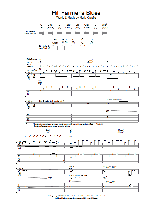 Download or print Mark Knopfler Hill Farmer's Blues sheet music, chords and digital score arranged for Guitar Chords/Lyrics. This Pop score includes 2 page(s).