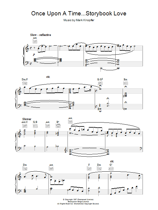 Download or print Mark Knopfler Once Upon A Time...Storybook Love (from The Princess Bride) sheet music, chords and digital score arranged for Piano Solo. This Film/TV score includes 4 page(s).