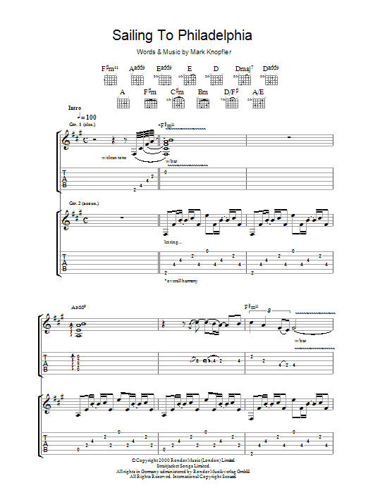 Download or print Mark Knopfler Sailing To Philadelphia sheet music, chords and digital score arranged for Guitar Chords/Lyrics. This Rock score includes 3 page(s).
