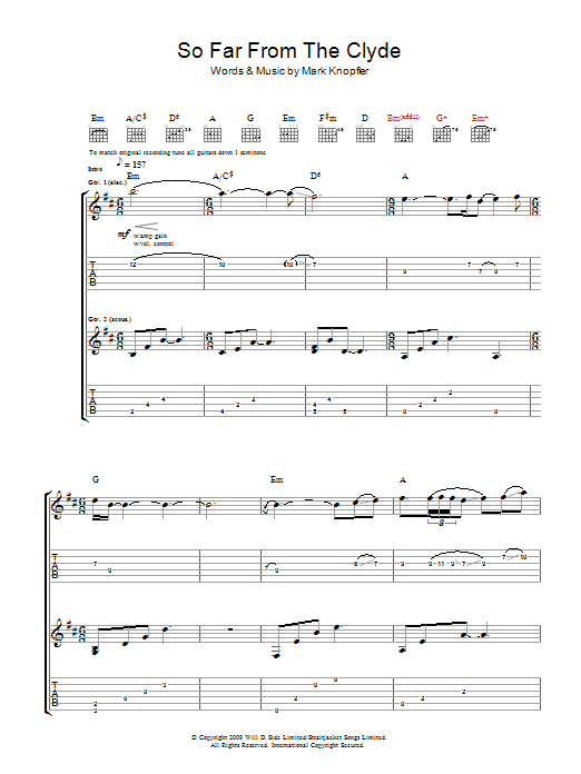 Download or print Mark Knopfler So Far From The Clyde sheet music, chords and digital score arranged for Guitar Tab. This Rock score includes 10 page(s).