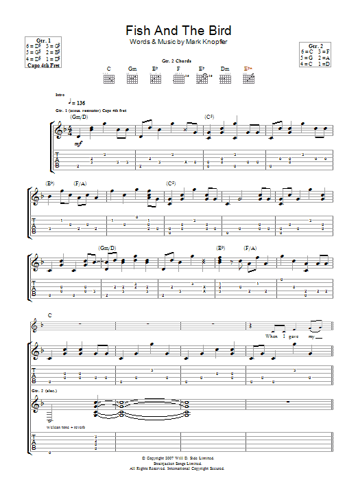 Download or print Mark Knopfler The Fish And The Bird sheet music, chords and digital score arranged for Guitar Tab. This Rock score includes 7 page(s).
