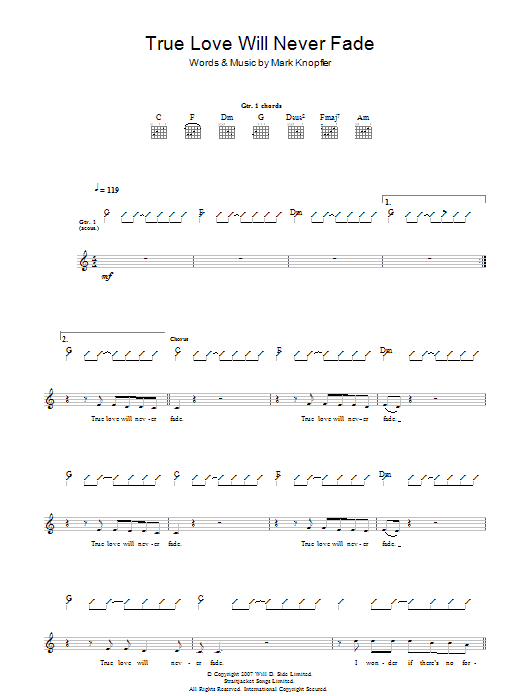 Download or print Mark Knopfler True Love Will Never Fade sheet music, chords and digital score arranged for Guitar Chords/Lyrics. This Rock score includes 3 page(s).