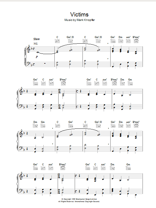Download or print Mark Knopfler Victims (from Last Exit To Brooklyn) sheet music, chords and digital score arranged for Piano Solo. This Film/TV score includes 3 page(s).