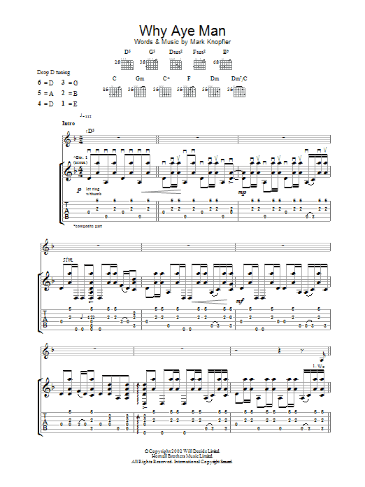 Download or print Mark Knopfler Why Aye Man sheet music, chords and digital score arranged for Guitar Tab. This Pop score includes 8 page(s).