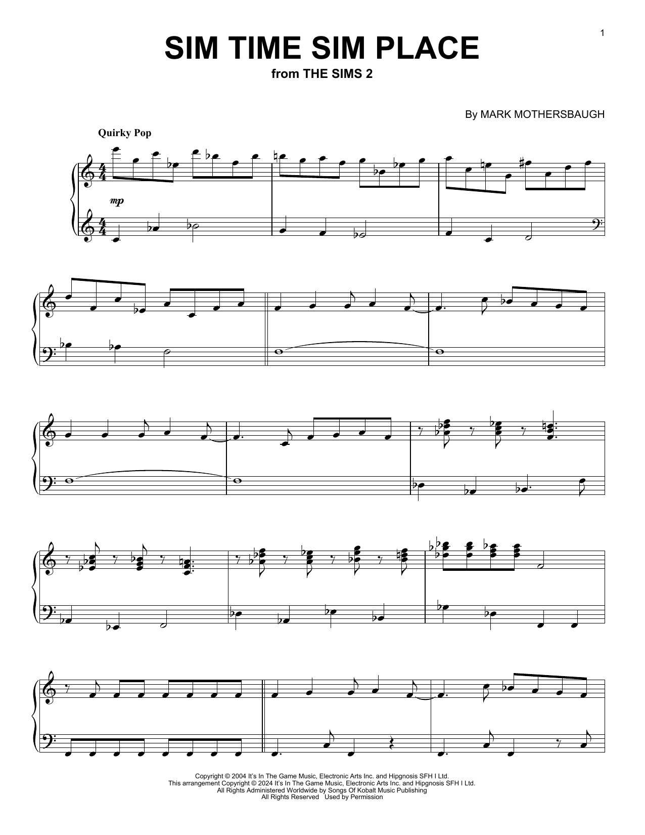Download or print Mark Mothersbaugh Sim Time Sim Place (from The Sims 2) sheet music, chords and digital score arranged for Piano Solo. This Video Game score includes 2 page(s).