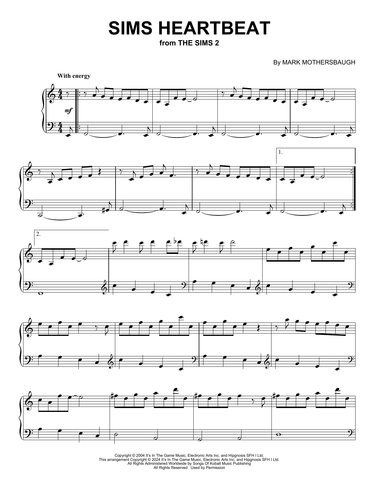 Download or print Mark Mothersbaugh Sims Heartbeat (from The Sims 2) sheet music, chords and digital score arranged for Piano Solo. This Video Game score includes 2 page(s).