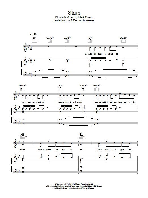 Download or print Mark Owen Stars sheet music, chords and digital score arranged for Piano, Vocal & Guitar Chords. This Pop score includes 6 page(s).