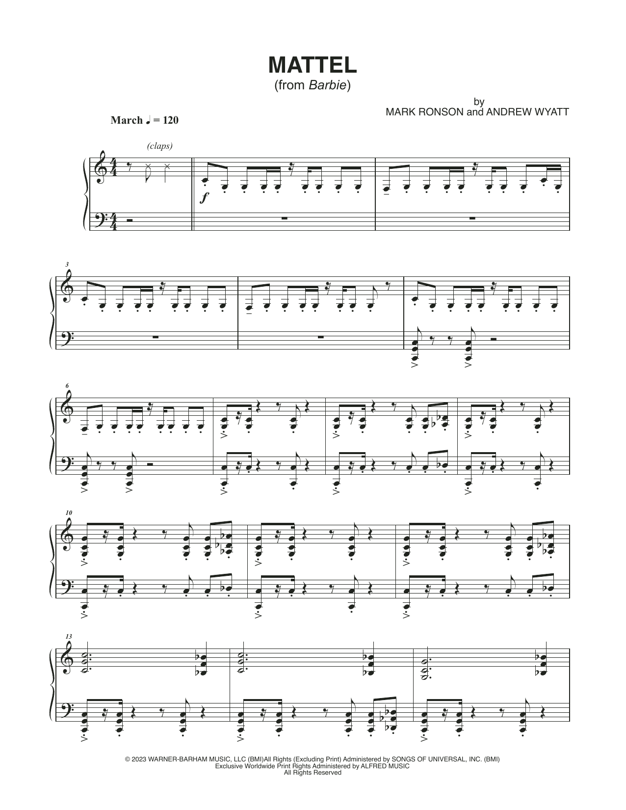 Download or print Mark Ronson and Andrew Wyatt Mattel (from Barbie) sheet music, chords and digital score arranged for Piano Solo. This Film/TV score includes 4 page(s).