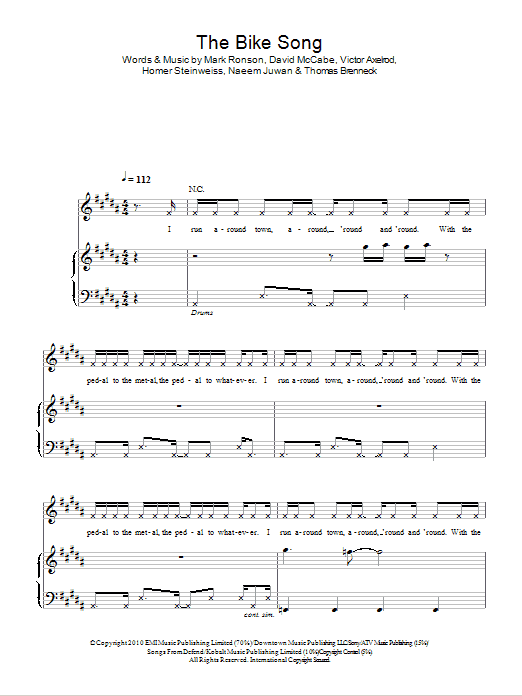 Download or print Mark Ronson & The Business Intl. The Bike Song sheet music, chords and digital score arranged for Piano, Vocal & Guitar Chords. This Alternative score includes 7 page(s).