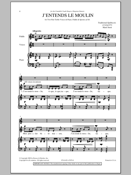 Download or print Mark Sirett J'entends Le Moulin sheet music, chords and digital score arranged for 2-Part Choir. This Folk score includes 9 page(s).