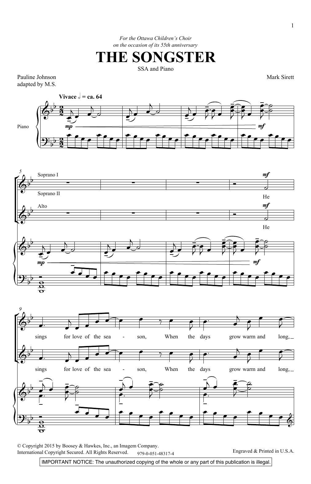 Download or print Mark Sirett The Songster sheet music, chords and digital score arranged for SSA Choir. This Concert score includes 10 page(s).