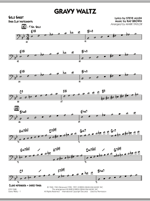Download or print Mark Taylor Gravy Waltz - Bass Clef Solo Sheet sheet music, chords and digital score arranged for Jazz Ensemble. This Jazz score includes 2 page(s).
