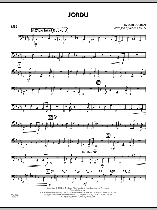 Download or print Mark Taylor Jordu - Bass sheet music, chords and digital score arranged for Jazz Ensemble. This Jazz score includes 3 page(s).