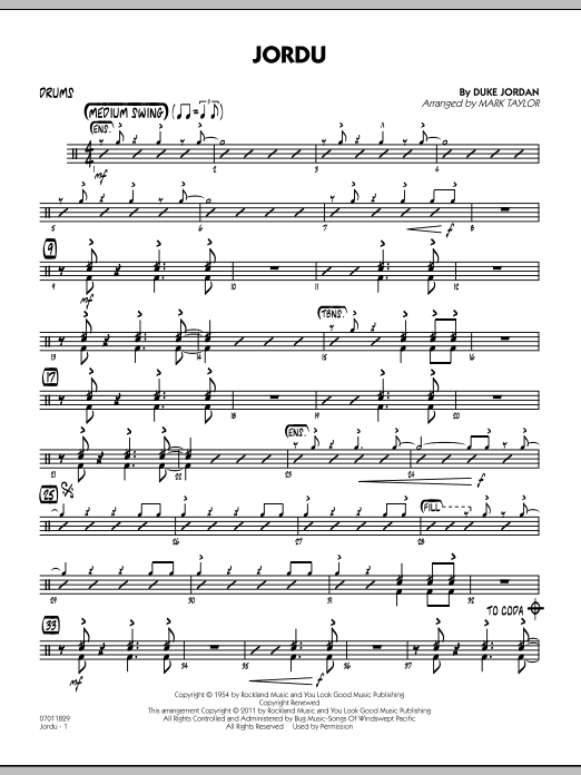 Download or print Mark Taylor Jordu - Drums sheet music, chords and digital score arranged for Jazz Ensemble. This Jazz score includes 3 page(s).