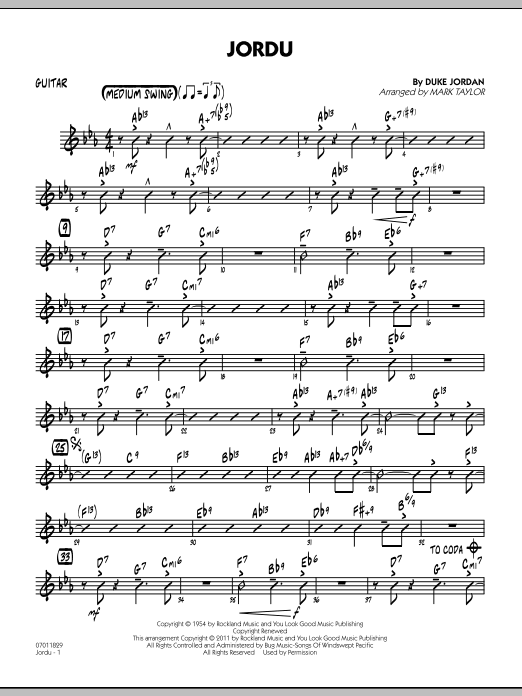 Download or print Mark Taylor Jordu - Guitar sheet music, chords and digital score arranged for Jazz Ensemble. This Jazz score includes 3 page(s).