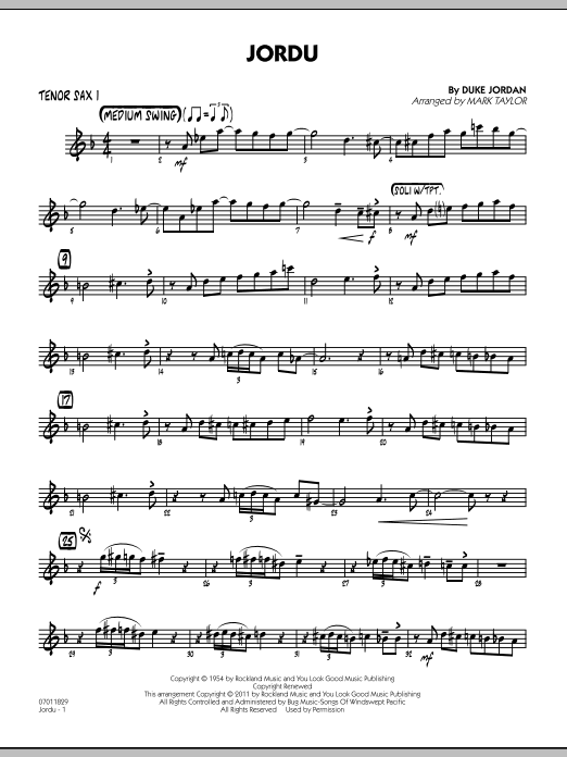 Download or print Mark Taylor Jordu - Tenor Sax 1 sheet music, chords and digital score arranged for Jazz Ensemble. This Jazz score includes 3 page(s).