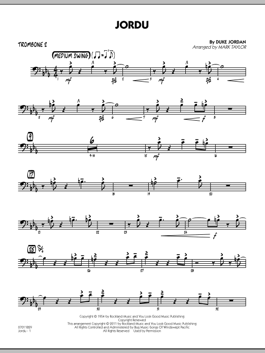 Download or print Mark Taylor Jordu - Trombone 2 sheet music, chords and digital score arranged for Jazz Ensemble. This Jazz score includes 3 page(s).