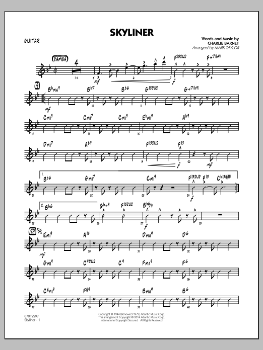 Download or print Mark Taylor Skyliner - Guitar sheet music, chords and digital score arranged for Jazz Ensemble. This Jazz score includes 3 page(s).