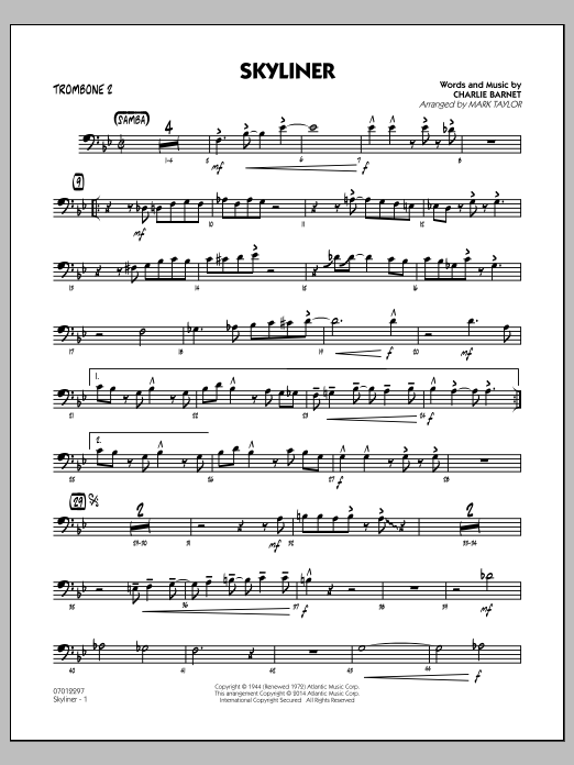 Download or print Mark Taylor Skyliner - Trombone 2 sheet music, chords and digital score arranged for Jazz Ensemble. This Jazz score includes 3 page(s).