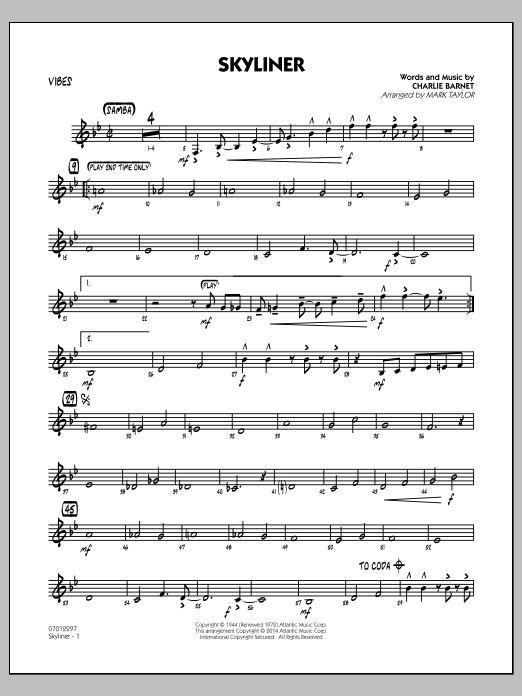 Download or print Mark Taylor Skyliner - Vibes sheet music, chords and digital score arranged for Jazz Ensemble. This Jazz score includes 2 page(s).