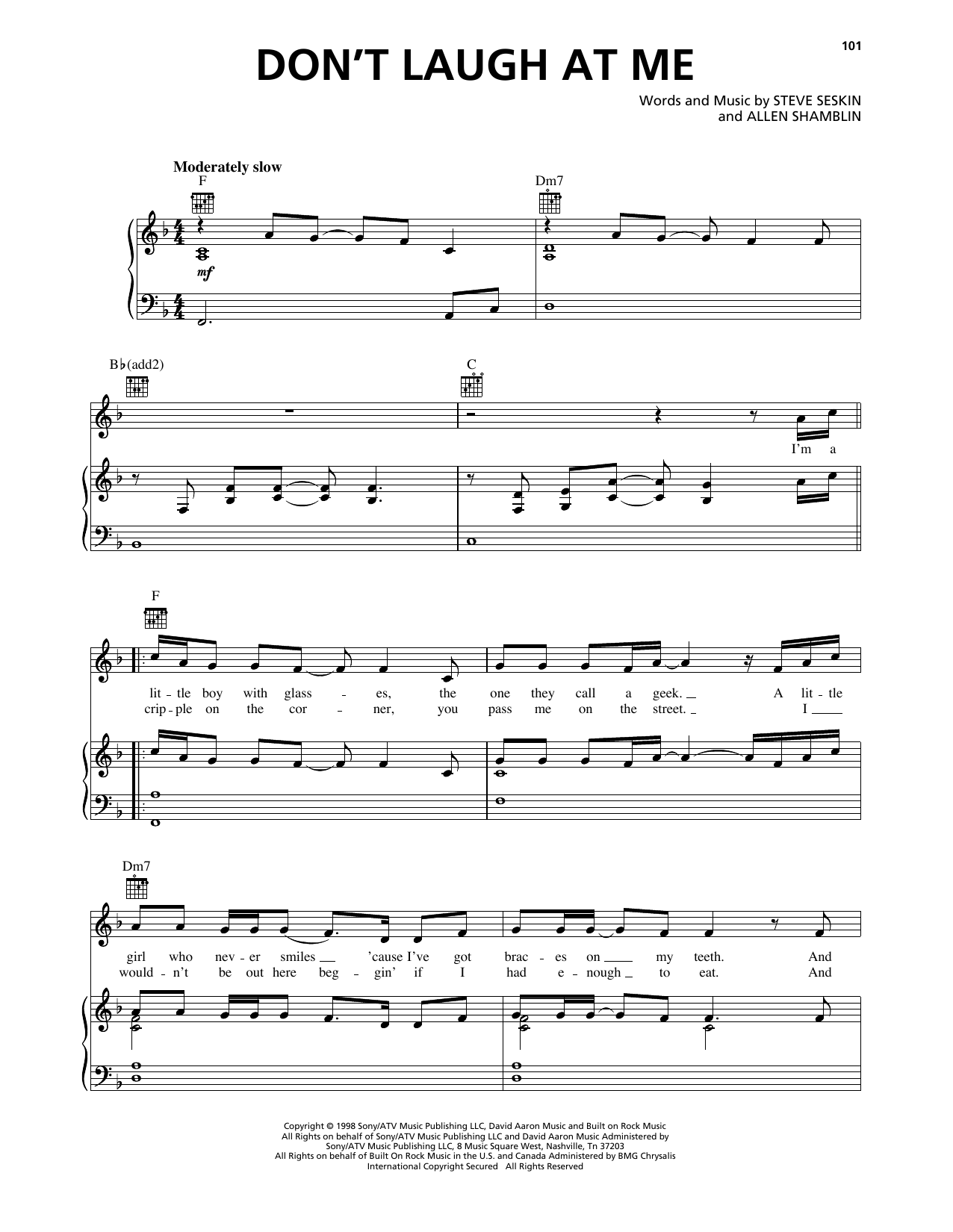 Download or print Mark Wills Don't Laugh At Me sheet music, chords and digital score arranged for Piano, Vocal & Guitar Chords (Right-Hand Melody). This Country score includes 5 page(s).