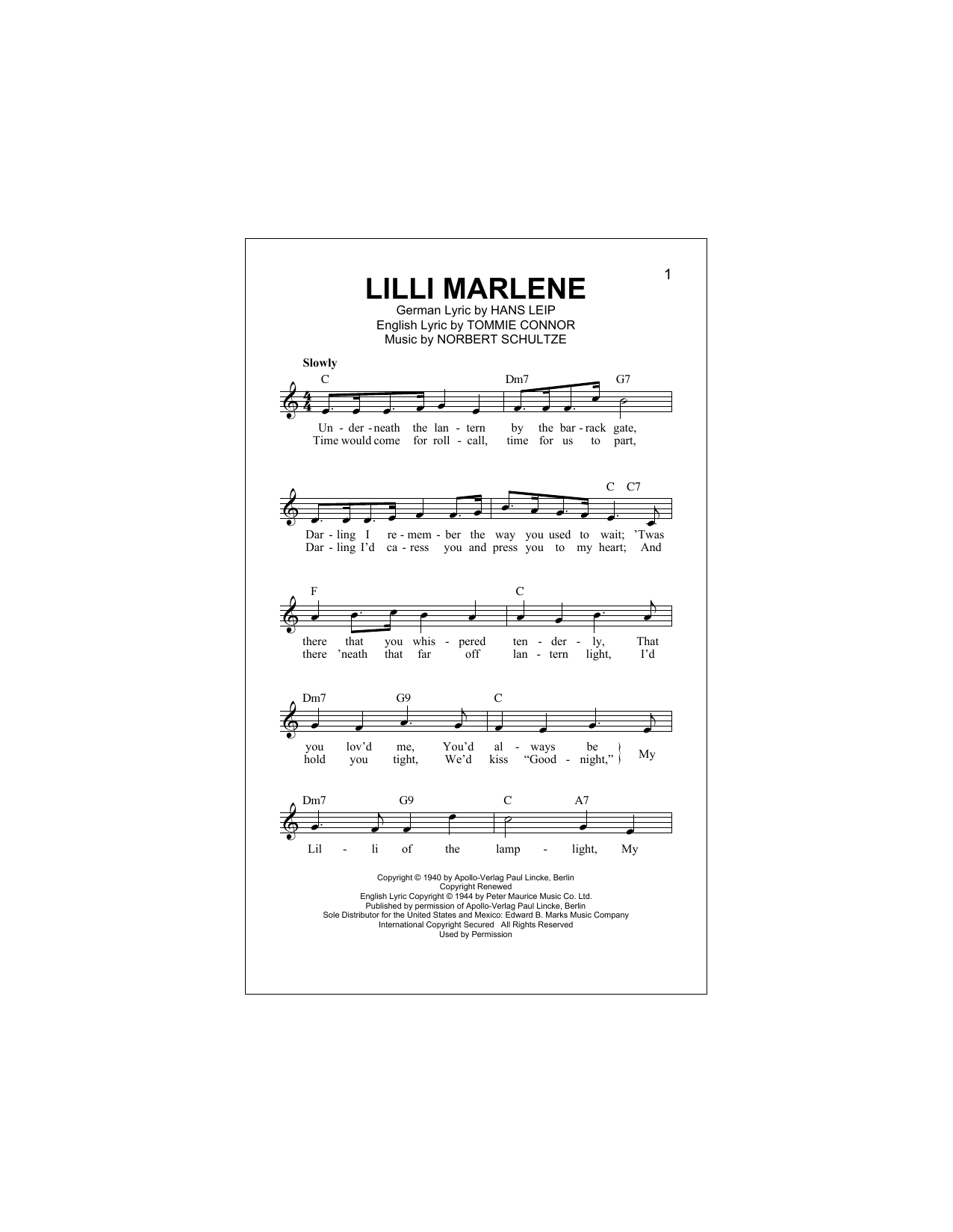 Download or print Marlene Dietrich Lilli Marlene (Lili Marleen) sheet music, chords and digital score arranged for Lead Sheet / Fake Book. This Jazz score includes 1 page(s).