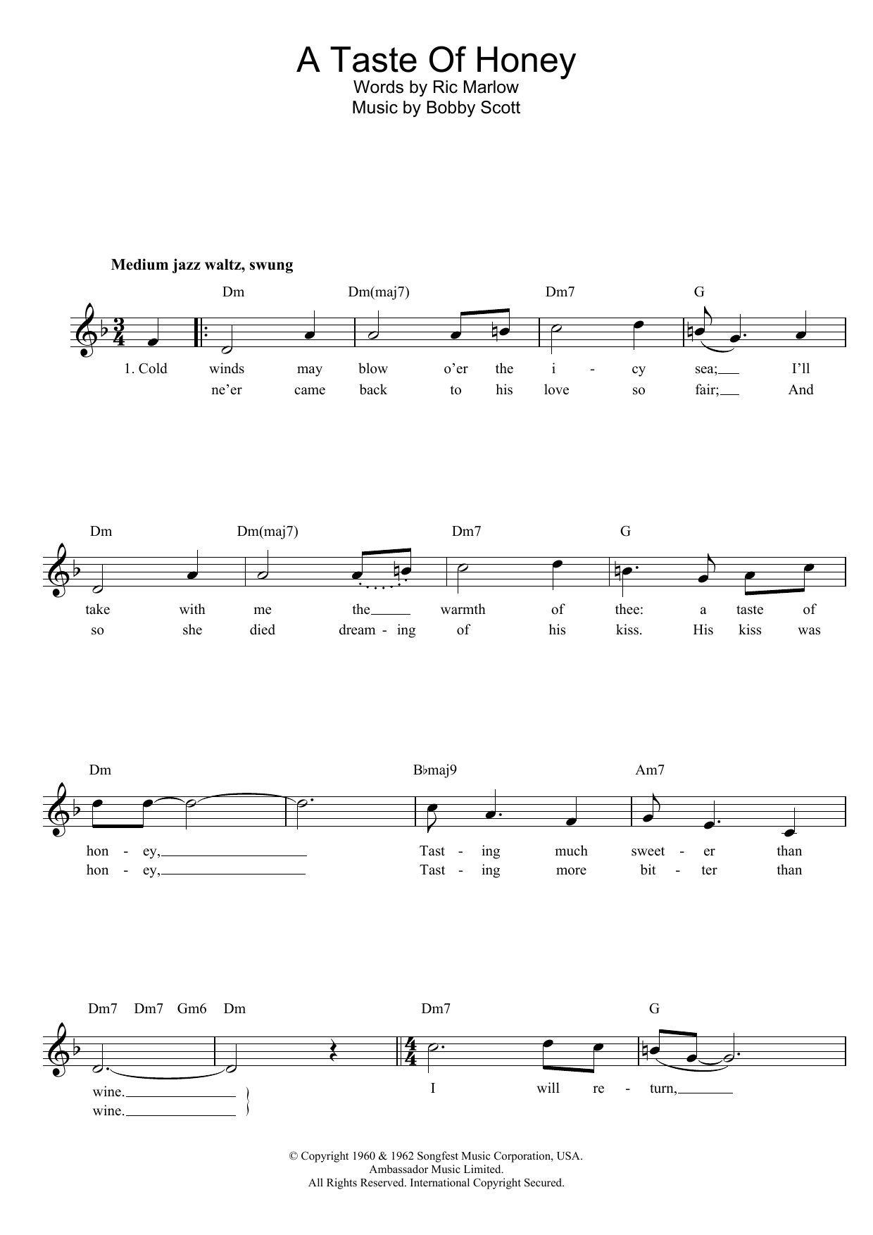 Download or print Marlow And Scott A Taste Of Honey sheet music, chords and digital score arranged for Lead Sheet / Fake Book. This Pop score includes 2 page(s).