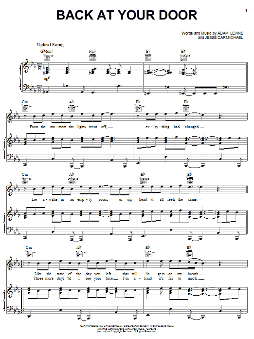 Download or print Maroon 5 Back At Your Door sheet music, chords and digital score arranged for Piano, Vocal & Guitar Chords (Right-Hand Melody). This Pop score includes 5 page(s).