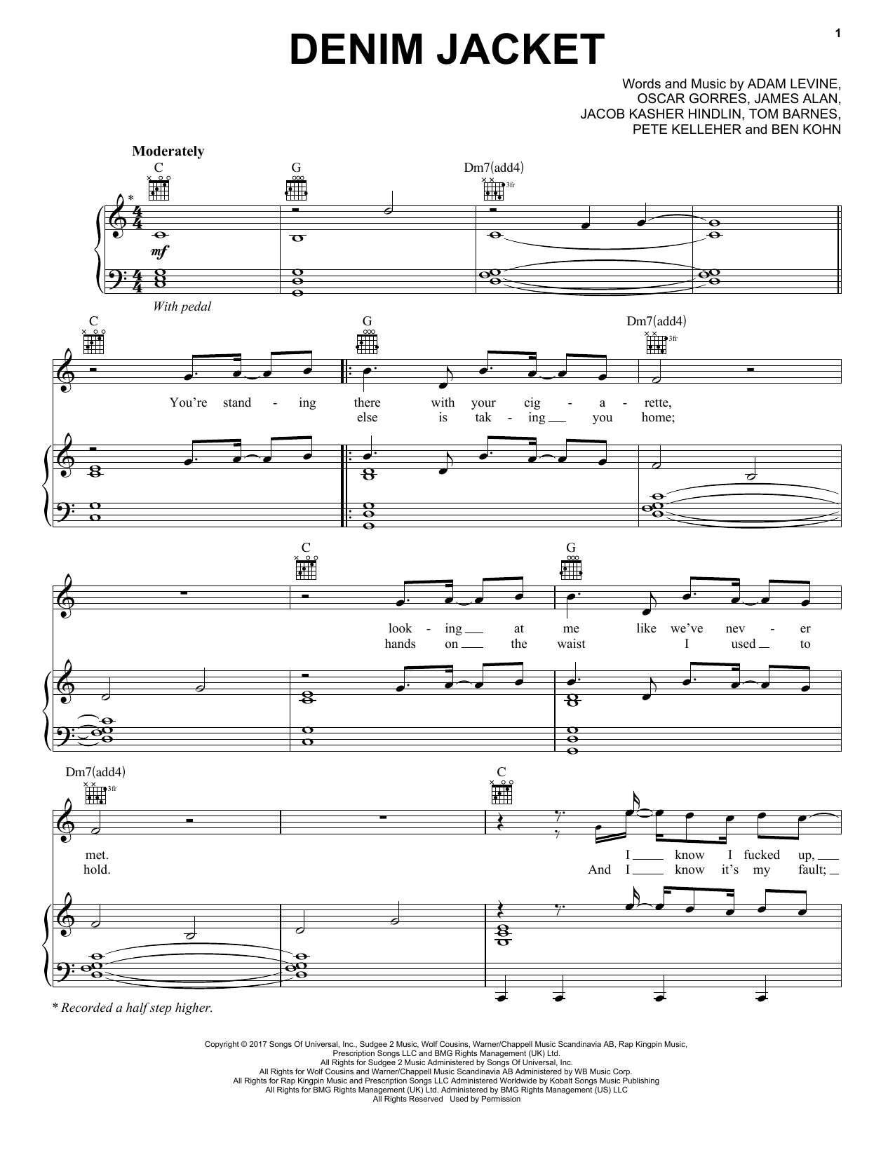 Download or print Maroon 5 Denim Jacket sheet music, chords and digital score arranged for Piano, Vocal & Guitar Chords (Right-Hand Melody). This Pop score includes 6 page(s).
