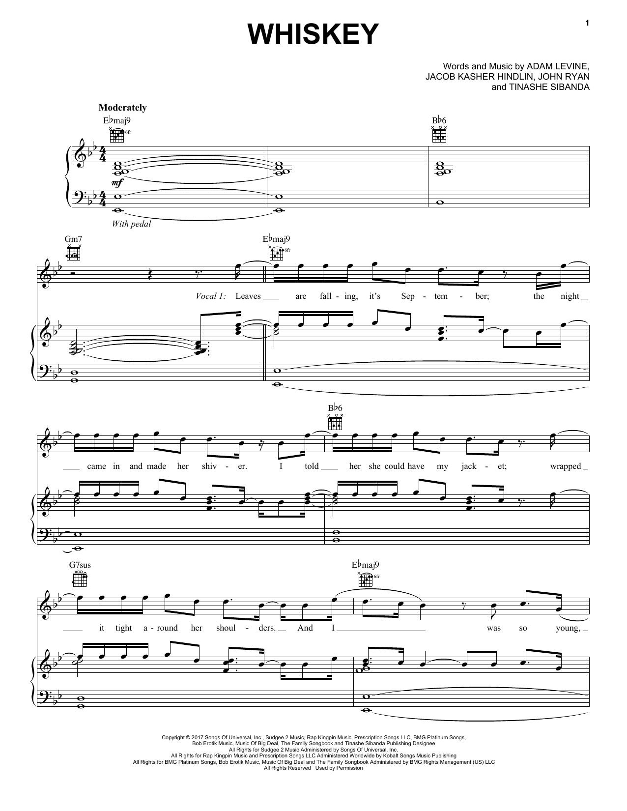 Download or print Maroon 5 feat. A$AP Rocky Whiskey sheet music, chords and digital score arranged for Piano, Vocal & Guitar Chords (Right-Hand Melody). This Pop score includes 8 page(s).