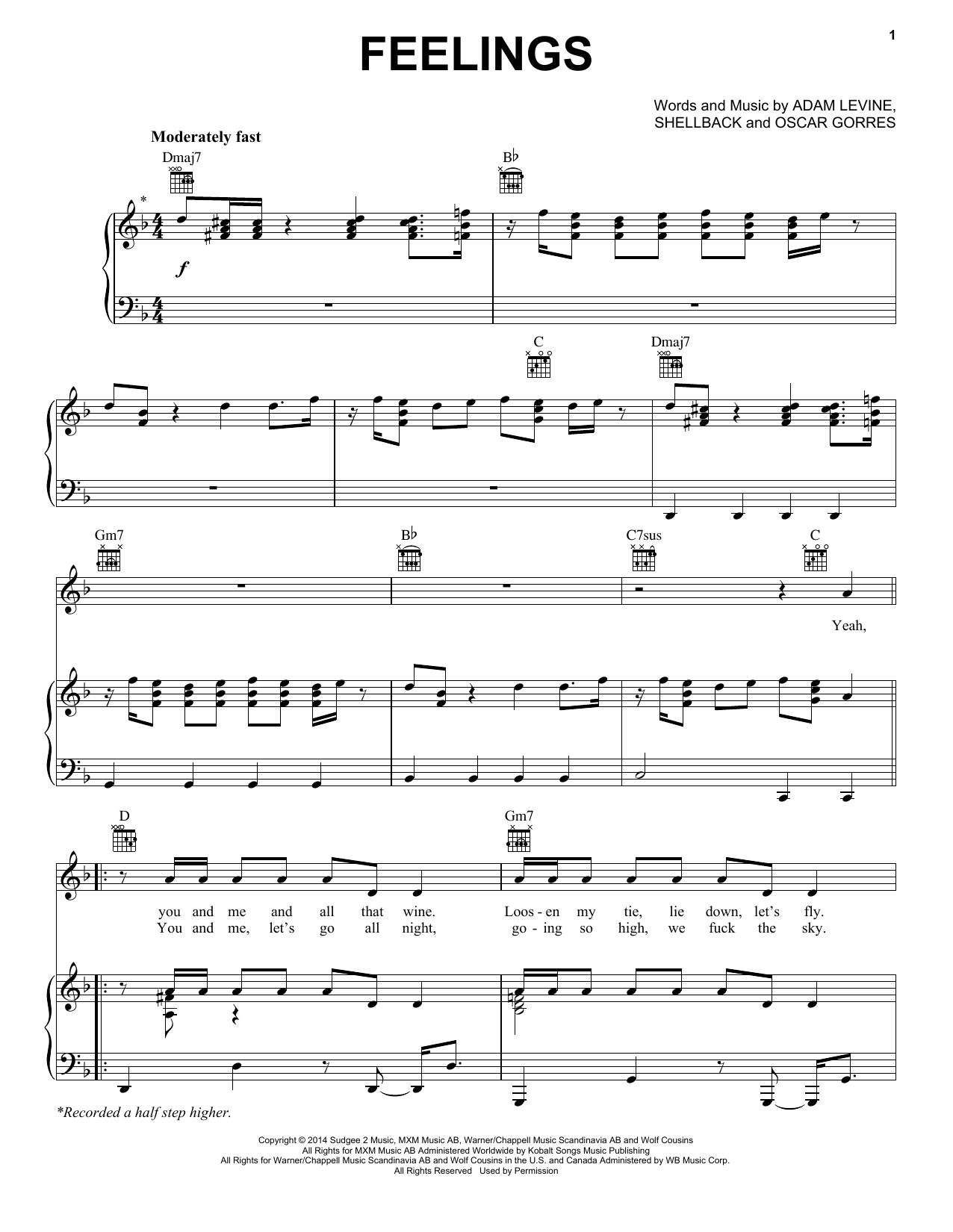 Download or print Maroon 5 Feelings sheet music, chords and digital score arranged for Piano, Vocal & Guitar Chords (Right-Hand Melody). This Pop score includes 7 page(s).
