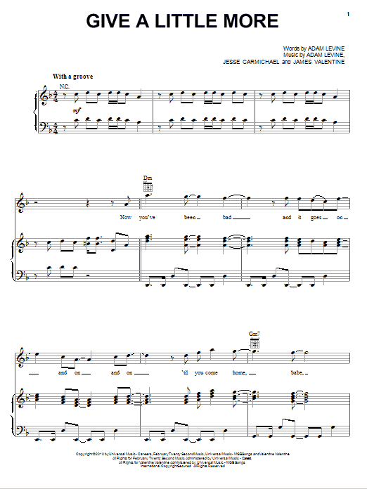 Download or print Maroon 5 Give A Little More sheet music, chords and digital score arranged for Piano, Vocal & Guitar Chords (Right-Hand Melody). This Pop score includes 6 page(s).