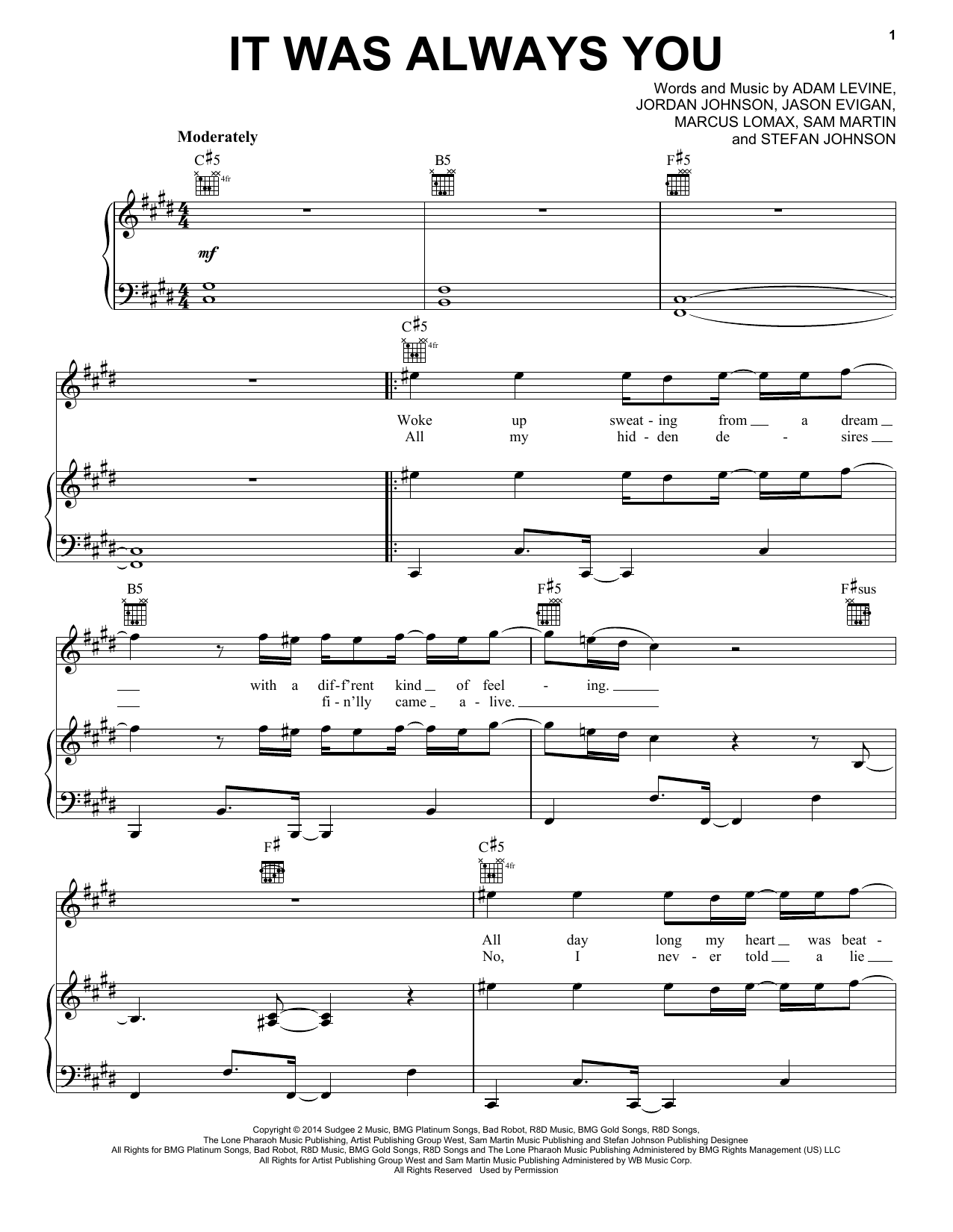 Download or print Maroon 5 It Was Always You sheet music, chords and digital score arranged for Piano, Vocal & Guitar Chords (Right-Hand Melody). This Pop score includes 6 page(s).