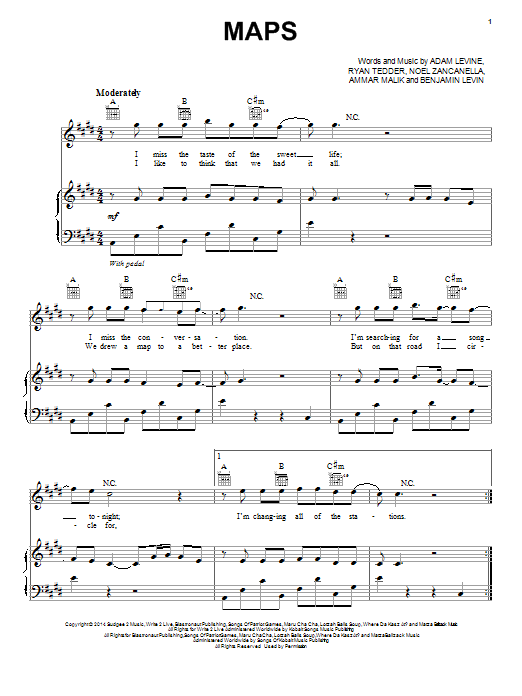 Download or print Maroon 5 Maps sheet music, chords and digital score arranged for Piano, Vocal & Guitar Chords (Right-Hand Melody). This Pop score includes 7 page(s).